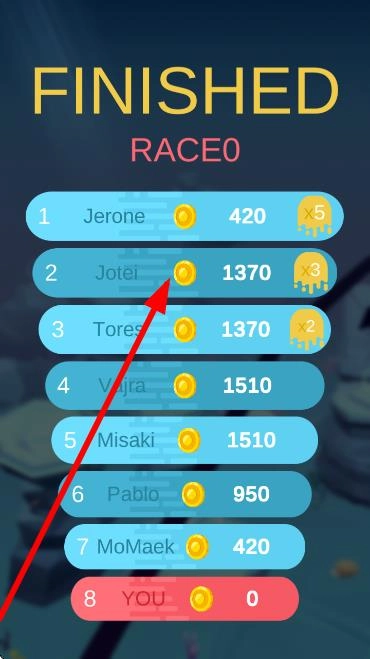 3、比赛结束后,查看FINISHED排名界面,了解名次和金币奖励,总结经验,可重新挑战提升排名。
