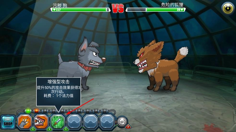 1、在对战界面,选择技能如增强型攻击,提升50%攻击效果并获得3次行动,耗费1个法力值。