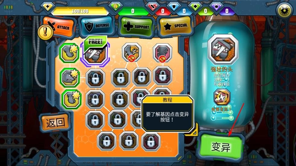 4、进入基因变异界面,点击变异按钮,可对角色基因进行变异,解锁或强化技能、提升属性,增强角色战力。