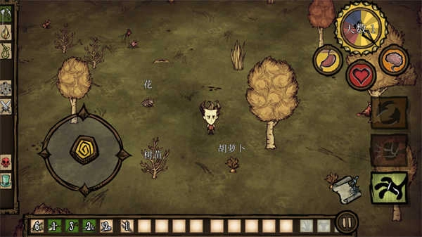 6、游戏就正式开始了,左边是控制角色方向的,右边是收集的,玩家需要收集一切能被利用的资源来躲避饥荒;
