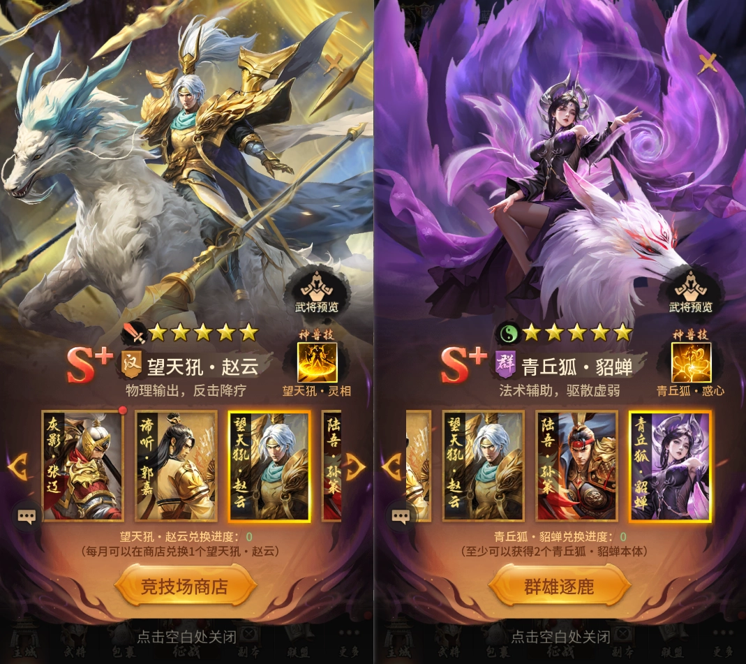 通过竞技场挑战获得声望,可获得S+望天犼·赵云