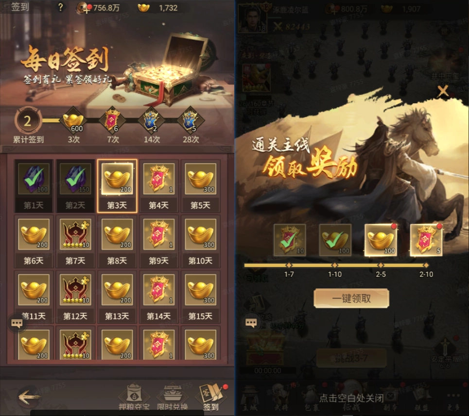 活动期间完成每日签到,通关主线,可获得大量元宝、升星石、招募令、五星武将碎片等丰厚奖励,三军未动,粮草先行,大量奖励助力主公战无不胜!