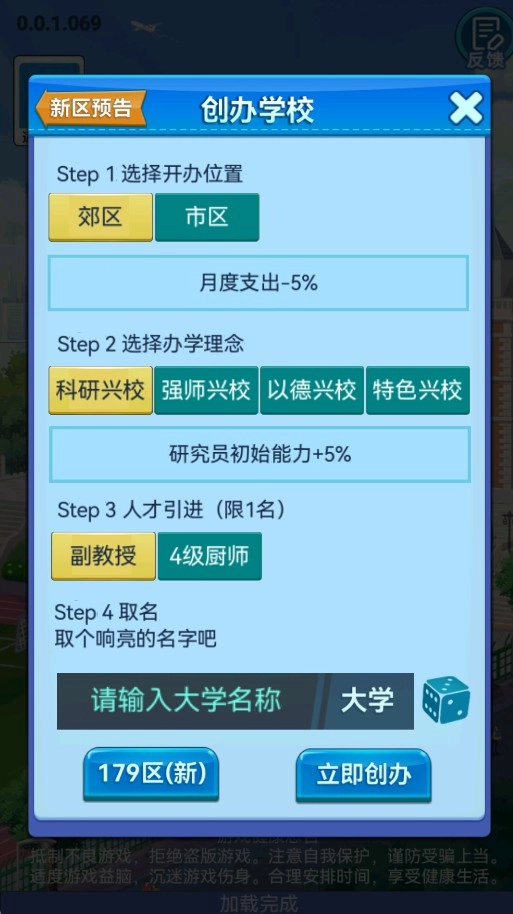 1、进入游戏后,首先创建一所属于自己的大学,包括命名、选址及初步校园建设规划。