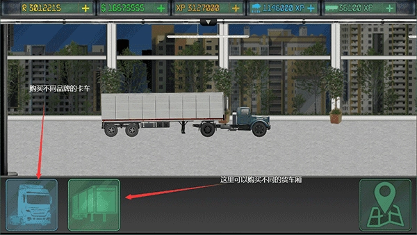 3、购车时可以自由选择品牌型号和货箱类型进行搭配,但如果想要升级到更高级别的重型卡车,就需要通过完成运输任务来赚取金币,然后逐步解锁这些车型。