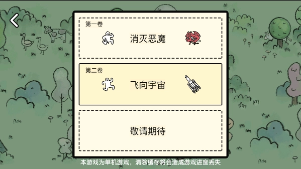 2、点击开始游戏后,我们可以选择两个剧情进行体验,第一卷“消灭恶魔”和第二卷“飞向宇宙”的游戏难度是一样的,只是剧情任务有所不同。