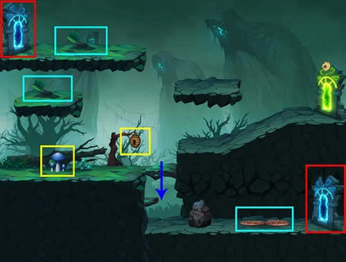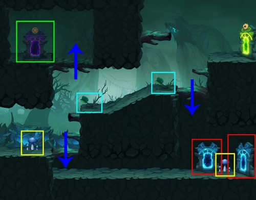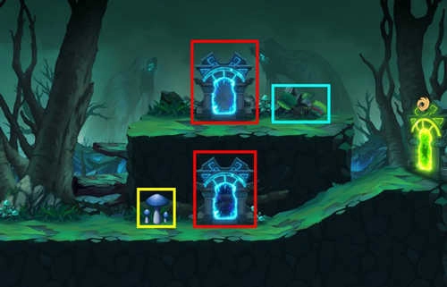 注意事项:场景中存在1棵毒蘑菇与1棵捕蝇草。下方区域有概率生成1棵食人花。两个红框的位置会随机出现1到2个蓝门,下方绿框内有概率出现箱子或幻兽中的任意一种,中部绿框则有概率出现紫门。