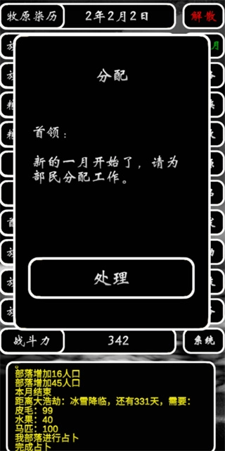 补:第二推荐60%以上的觅食或者采集或者圈养,剩下的全点种植,我建议尽量二次分配就只分两个效率很高,我建议去结盟只需要付出最多800人口能让你拿到资源他经常给你送很快就达标了前期靠结盟能把渡劫配齐,后期就换或者打。随缘过劫难。看脸。