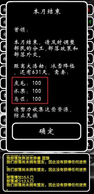 新增36种可交易的资源物品,初始健康值调整为100,下调了部落间的交易汇率,提升了进贡事件的触发概率,增加了人口获取事件中的人口数量,修复了太阳风暴劫难的相关问题,新增陨石劫难与海潮劫难两种灾害类型,异族部落名称旁会显示其所需的交易资源信息。
