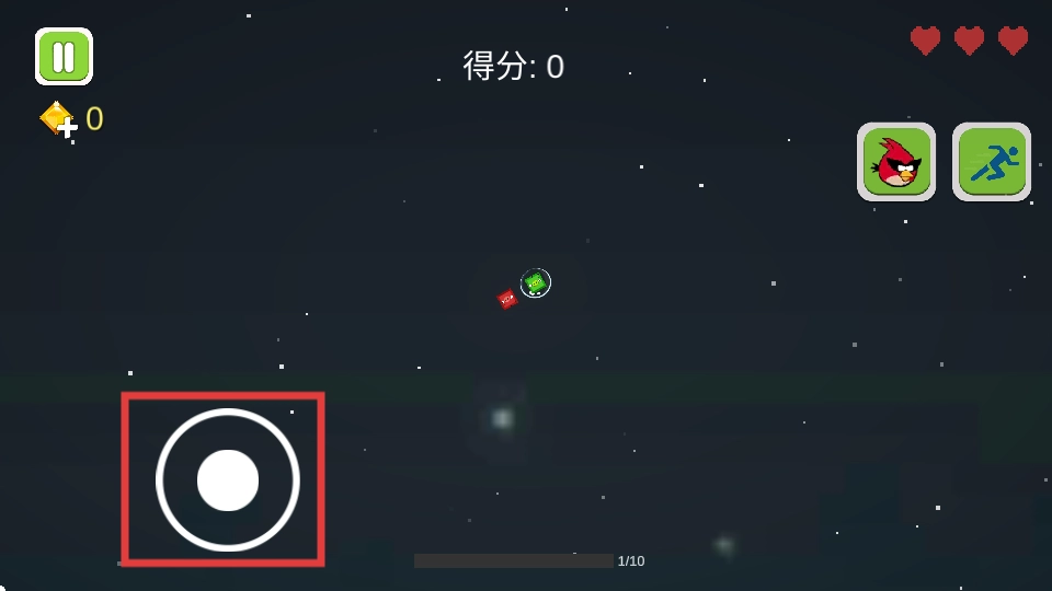 2、通过左侧虚拟摇杆控制角色移动,在场景中灵活走位,准备攻击方块猪。
