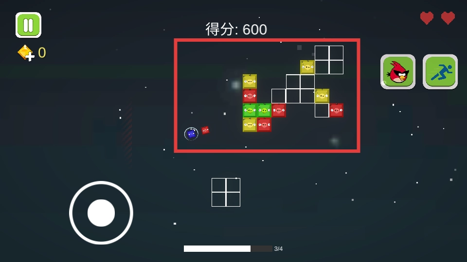3、攻击不同颜色的方块猪,积累得分,同时注意躲避方块猪的反击。