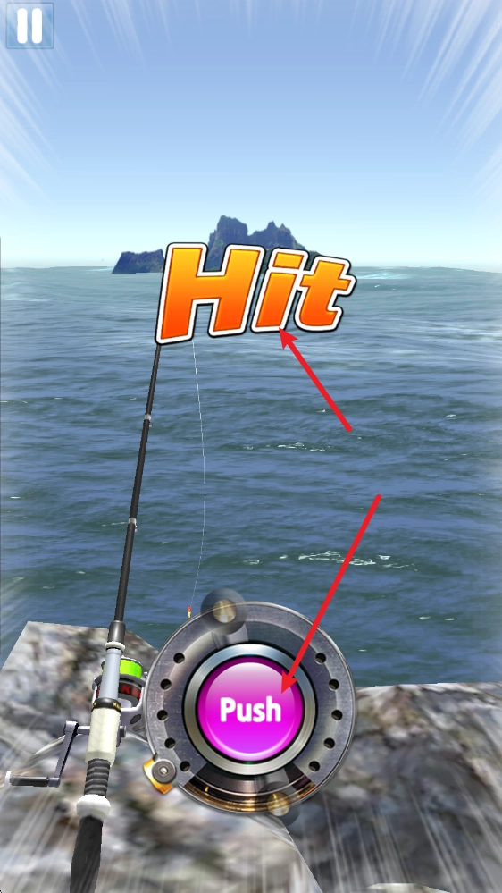3、成功抛竿后只需静待鱼儿咬钩,一旦屏幕上出现“Hit”的提示,就需要点击“PUSH”按钮来收竿了。