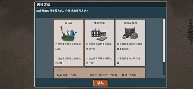 4、接下来,你需要在这里选择自己的体验方向:可以成为园艺家,尽情享受开拓创造的乐趣;也可以选择当生态学家,在资源有限的条件下兼顾美观与布局的最优解;要是想挑战自我,还能成为环境工程师,专注于为这片土地重塑良好的生态环境。选好对应的身份(难度)后,找到并点击“确认”按钮就能开启游戏了。