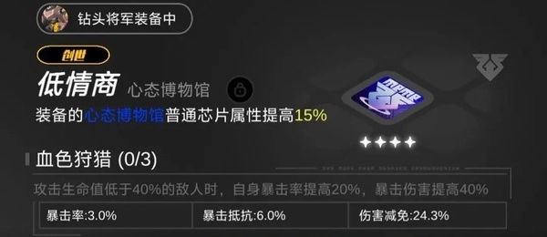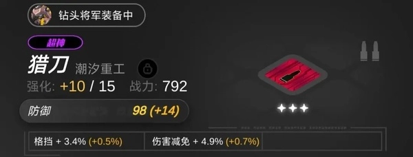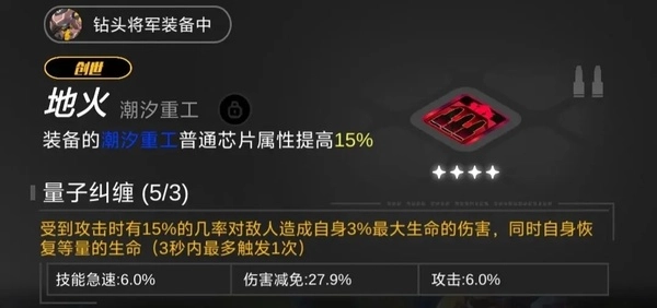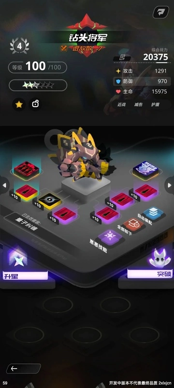 4、钻头将军坦,建议主堆防御属性,芯片副词条优先选减伤(这个搭配是我在论坛上看到的)。生命方面有皮皮辅助,不用堆太多。我这只坦目前没星级,是因为之前把抽到的卡全分解去换芯片了,结果红芯片没刷到,黄星也用完了。