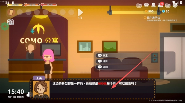 1、与公寓前台交互,查看房租信息,选择确定进入议价流程。