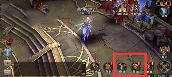 屏幕右下角的功能菜单包含锻造与技能两个选项。锻造菜单用于提升角色的外在装备,技能菜单则针对角色当前使用的技能进行升级,需要注意的是,技能等级不得超过角色自身等级。例如图片里角色等级为30级,那么其技能等级最高也只能达到30级。