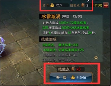 点击技能菜单后,消耗金币与技能点来提升技能等级,技能等级越高,所需的技能点和金币就越多。当技能点不足时,可使用钻石购买,且每日购买次数存在限制。