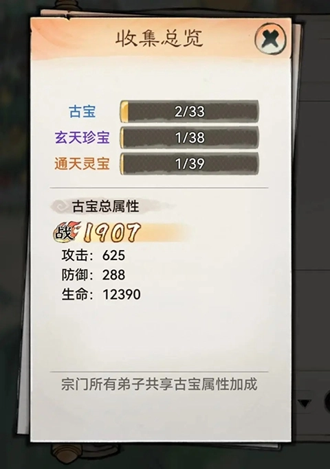 玩家点击古宝界面左下角的总览,可以查看古宝收集进度,了解当前古宝属性加成。