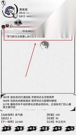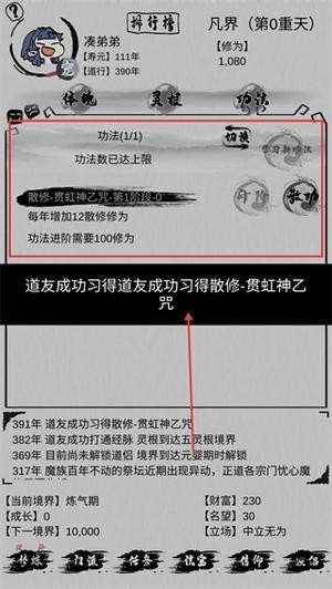 1、解锁新功法需要积累1000修为和50财富,达成条件后就能开启新能力,既能提升修炼效率,也能为境界突破提供助力。