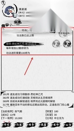 3、目前该功法要进阶得有100点修为,等修为够了点击进阶按钮,就能提升功法等级,这样每年获得的修为会变多,能帮你更好地修炼。