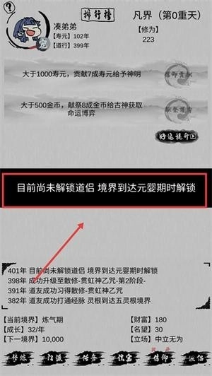 4、道侣系统未解锁需将境界提升至元婴期,达到后可解锁道侣功能拓展修炼相关玩法。