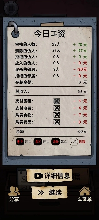 一天结束后,你能查看今日的审查结果,下方还能看到家庭成员的具体情况。