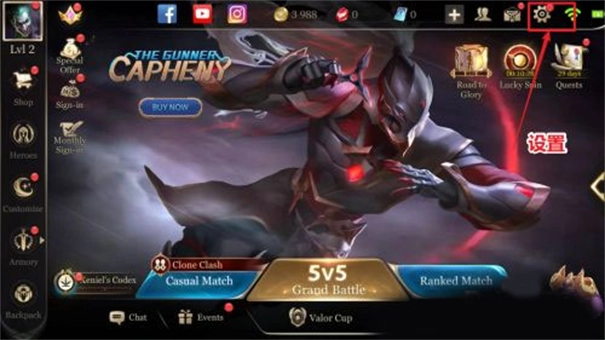 1、打开传说与对决越南服后,点开右上角的齿轮样设置。
