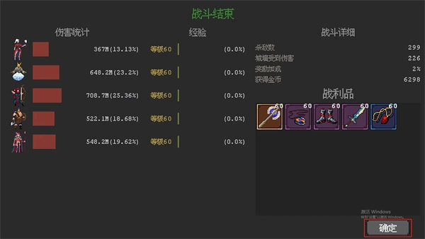 2、在经历过重重大战之后,系统会对战斗过程进行数值统计,你可以看到各个战斗英雄的伤害统计,以及更多战斗详细过程,点击下方的【确认】按钮即可进入下一步。