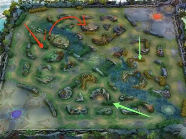 敌方打野前期弱势或者敌方阵容前期偏弱无控制。先打掉自家弹簧花跳到敌方红区(红色箭头位置),记得发信号给中路,防止被反抓了