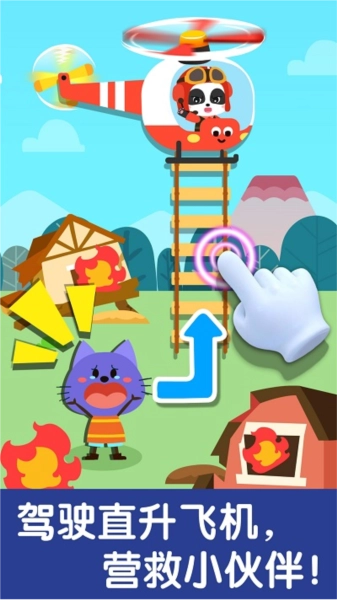 体验消防车——了解它的救援作用!城堡起火了。宝宝开着消防车,加入灭火行动。小伙伴被大火困住了?从车上取出消防水枪,对准大火、喷水,太棒了!顺利扑灭了火源。