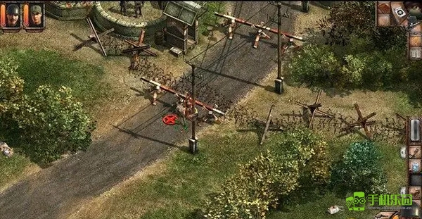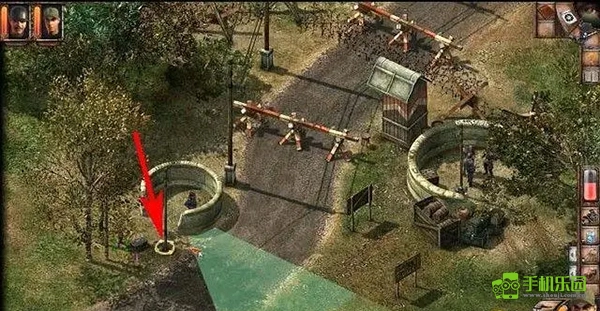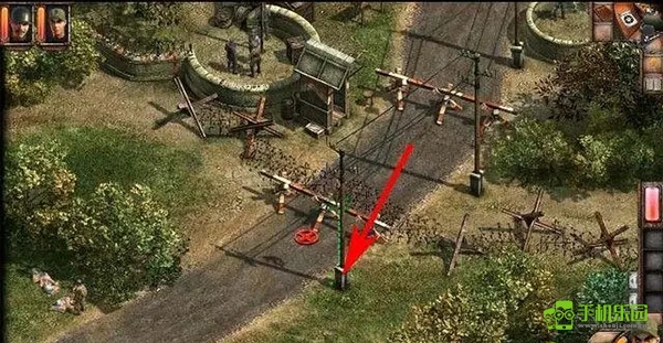 选择另一名士兵(点击屏幕左上角的士兵头像),移动到下图箭头指示的电线杆位置,接着攀爬上去。