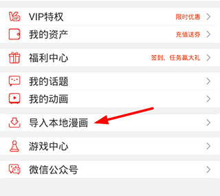 3、在我的个人页面中可以看到下面导航中有导入本地漫画的选项,点击选择