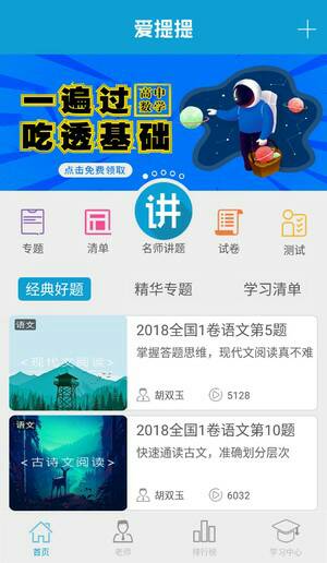 首页设有专题、清单、名师讲解、试卷、测试五大功能。