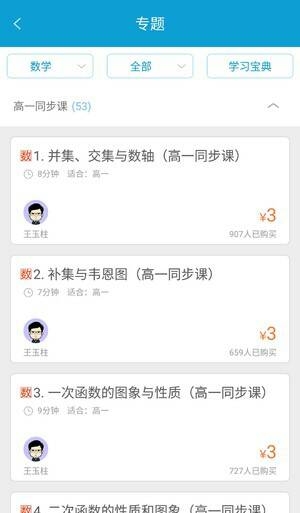 在专题功能区用户可以按照学科、学习种类(方法、技巧、概念、综合)进行选择视频讲解课程,也可以直接点击升学宝典,成为VIP,进入提分快捷通道。专题功能区针对学科知识点开设视频讲解,帮助高中生逐一突破知识点,扫除备考路上的绊脚石。只不过本功能提供的专题讲解服务,一般都需要付费才能够观看。视频讲解时长在5-30分钟不等,价格在0-20元不等。