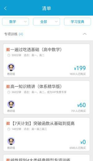 相比于专题功能区针对知识点开设视频讲解,清单功能区侧重于各学科的综合性学习,涵盖了专项练习、一轮复习(同步课)、定点突破、二轮复习、学习计划五大类别的综合性学习内容。该功能区中的五大类别涵盖了时长为45-600分钟不等的视频,费用在0-100元不等。