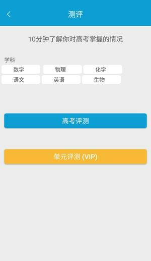 在测试功能区高中生可以对某一学科进行小测评,并生成测评报告。对于错题系统会提供视频讲解。除此之外,本功能设有单元测评,高中生可以对某一学科的某一单元进行测评,测评报告可以帮助使高中生更具有针对性地进行备考。不过单元评测需要成为VIP才能使用。