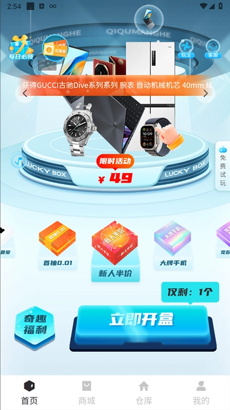 1、高价值好物:仅需花费几十元,用户便有机会开出大牌手机、笔记本电脑、电动车等高价值物品。