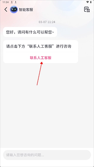 3、然后在打开的智能客服页面中点击【联系人工客服】即可