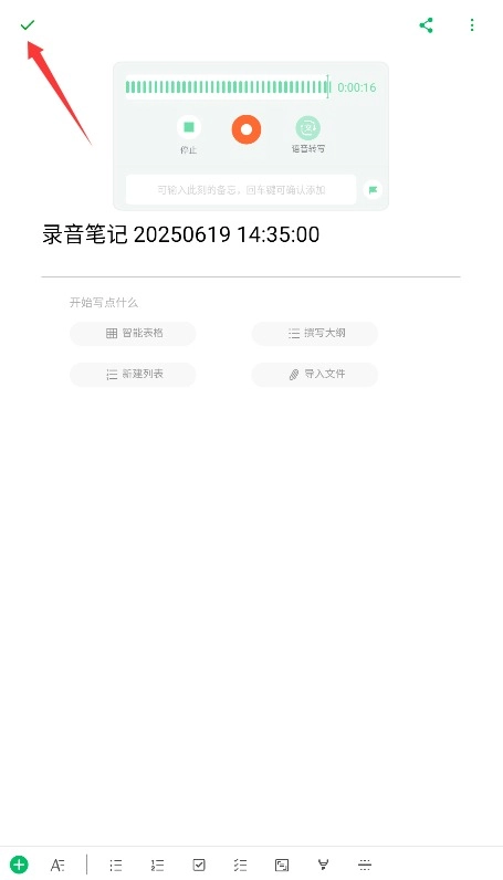 3、录制结束后可为音频添加标题备注,支持插入智能表格或附件,最后点击保存完成归档。