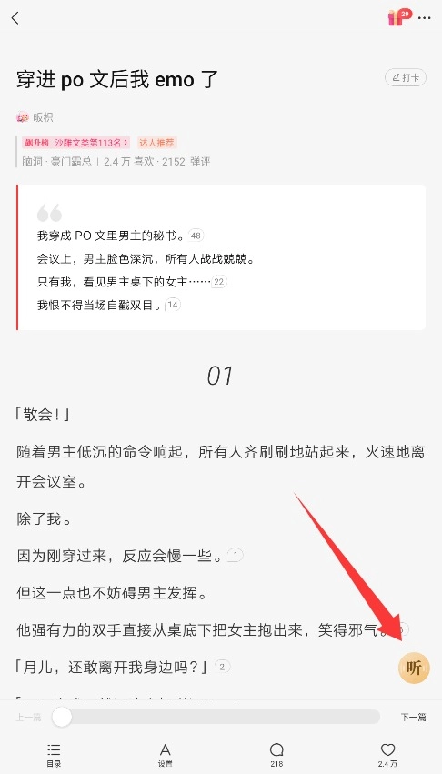 3、打开小说正文页面,点击右下角听字图标即可切换至语音朗读模式收听内容。
