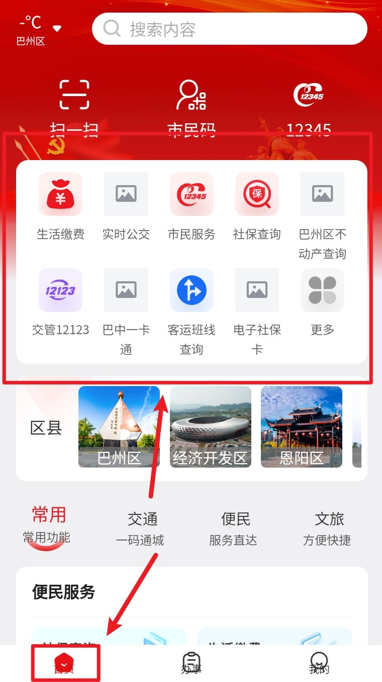 3. 在首页可浏览常用政务功能,如生活缴费、社保查询等服务。