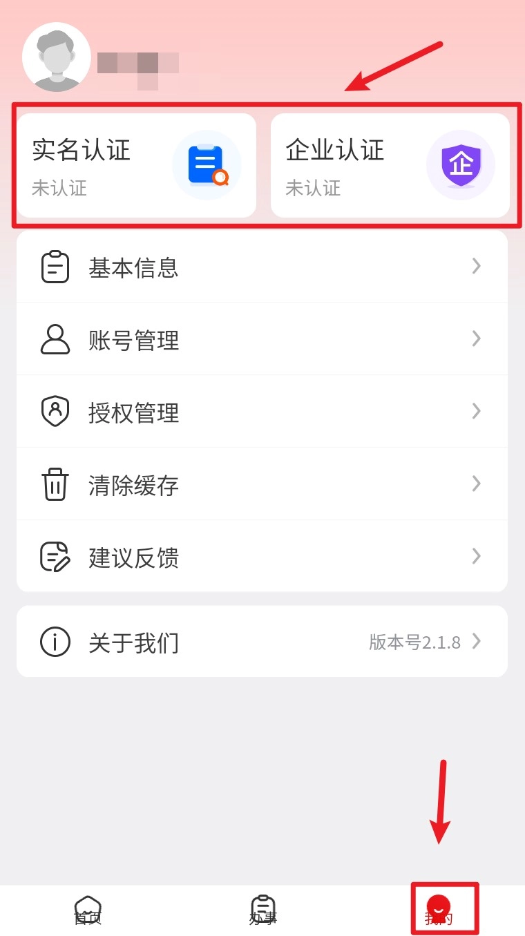 2. 登录成功后点击底部“我的”,进入页面进行实名认证与企业认证。