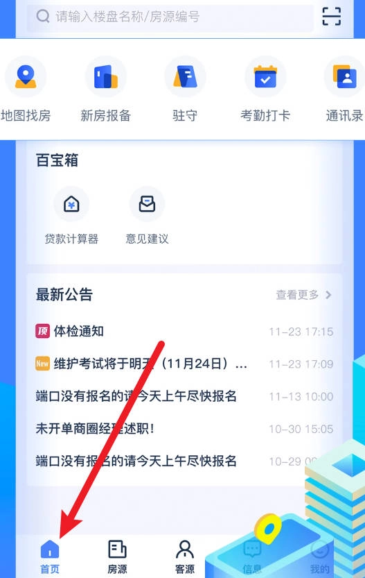 1.点击“首页”可查看公告通知和实用功能模块入口。