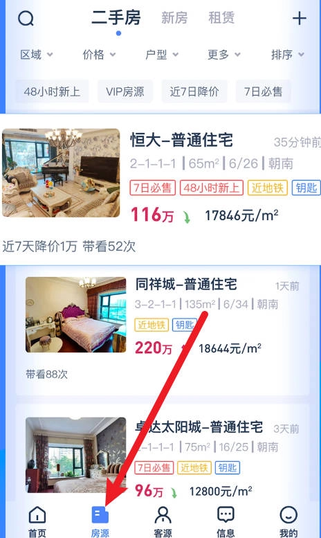 2.进入“房源”页面,可根据筛选查看推荐房屋信息。