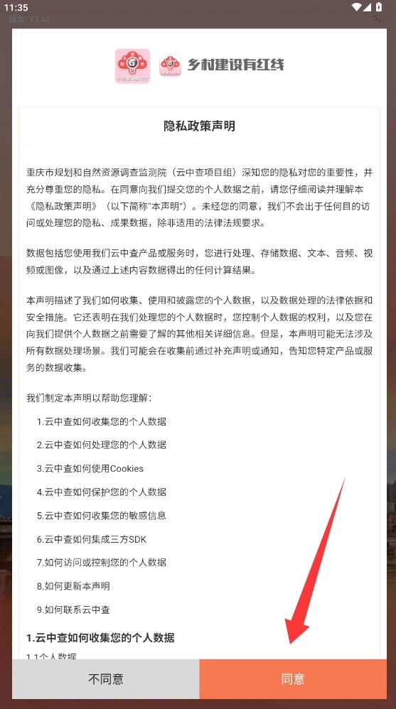 1、打开云中查,仔细阅读用户协议后点击"同意并继续"进入注册页面。