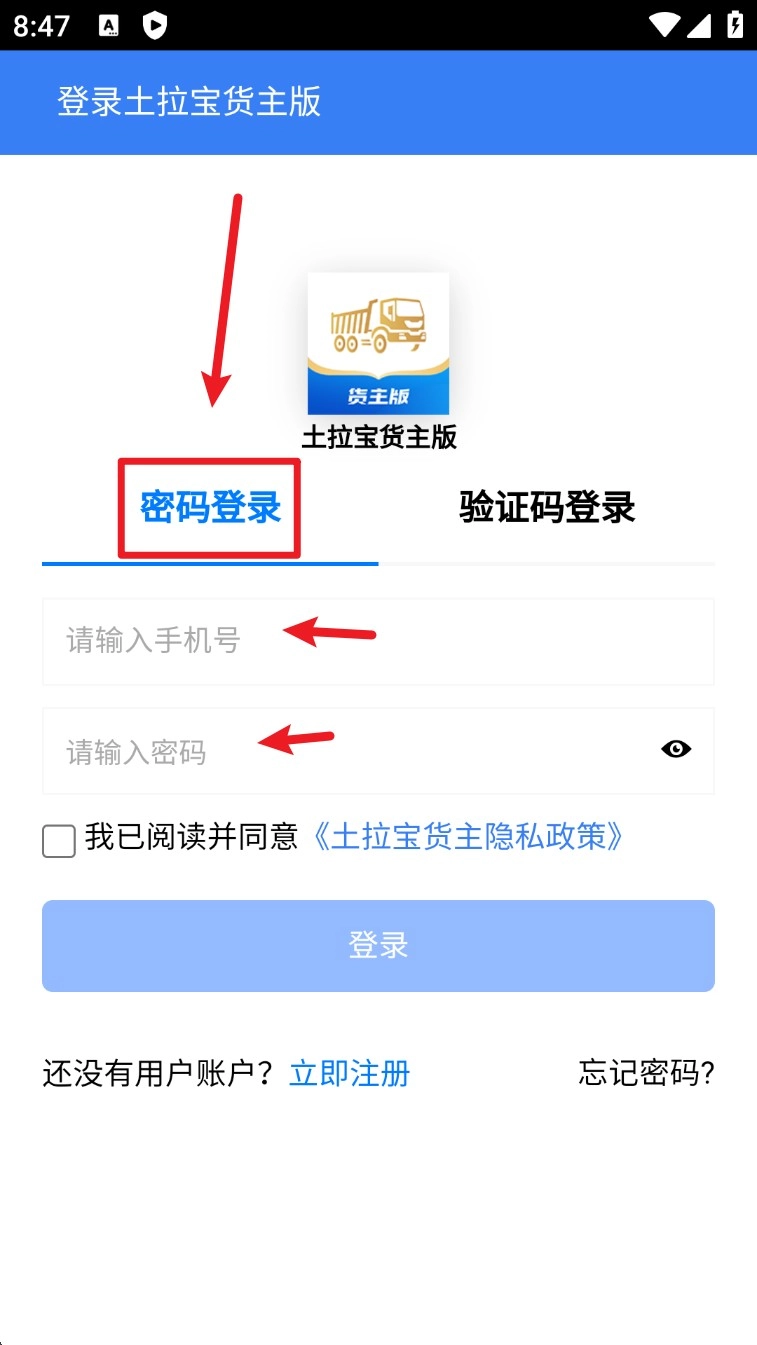 2. 回到登录页面,在相应位置输入已经注册好的手机号与密码,选中隐私协议,接着点击「登录」按钮,即可进入主页面。