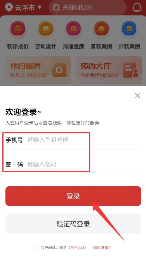 1、打开装修攻略大全,在登录页面输入您的手机号码,获取并填写验证码完成快速登录 。