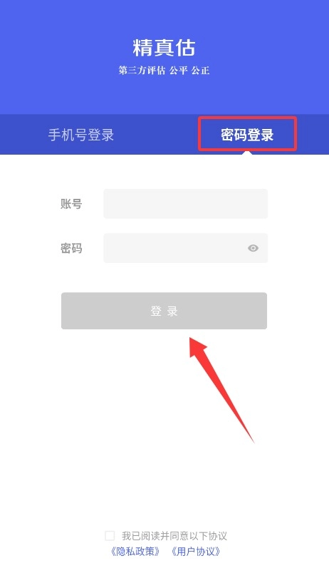 1、启动精真估云评估,仔细阅读用户协议后,点击"同意并继续"进入主页面。