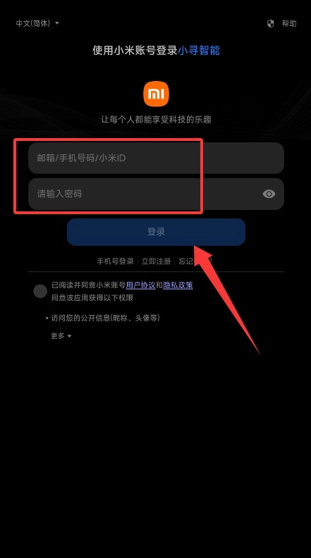 2、在登录界面选择手机号、邮箱或小米账号任一方式,输入验证码完成账号验证。