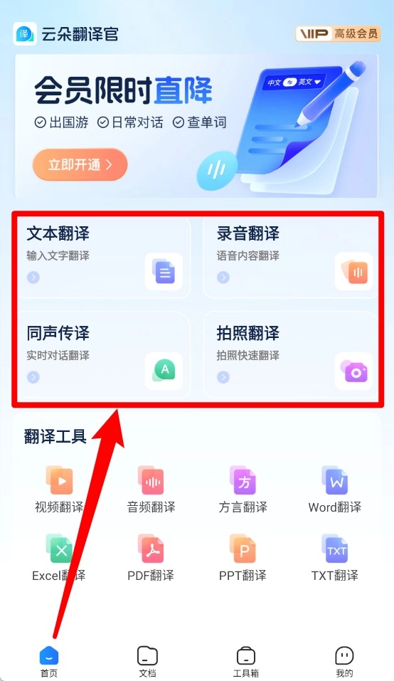 1、 首页支持文本、录音、同声、拍照多种翻译方式自由切换。