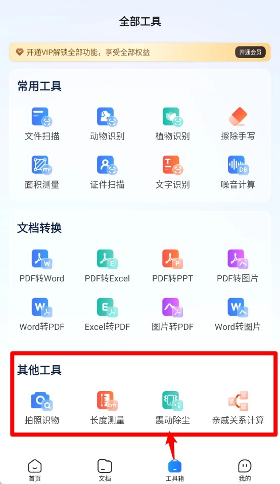 3、工具箱内配备了文字识别、文件扫描、噪音计算等一系列常用的智能工具。